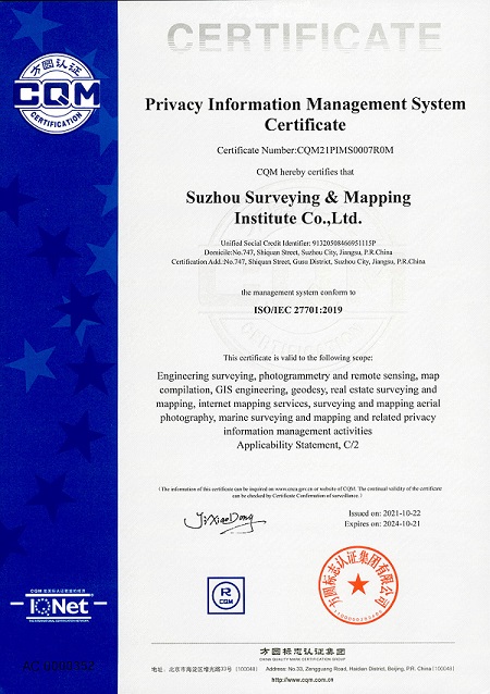 時(shí)間:2021年11月01日 近日,方圓江蘇公司為蘇州市測(cè)繪院有限責(zé)任公司頒發(fā)我司首張“隱私信息管理體系認(rèn)證”認(rèn)證證書(shū)。認(rèn)證范圍為:工程測(cè)量、攝影測(cè)量與遙感、地圖編制、地理信息系統(tǒng)工程、大地測(cè)量、不動(dòng)產(chǎn)測(cè)繪、互聯(lián)網(wǎng)地圖服務(wù)、測(cè)繪航空攝影、海洋測(cè)繪及相關(guān)隱私信息管理活動(dòng)。