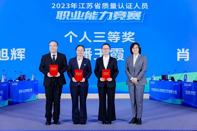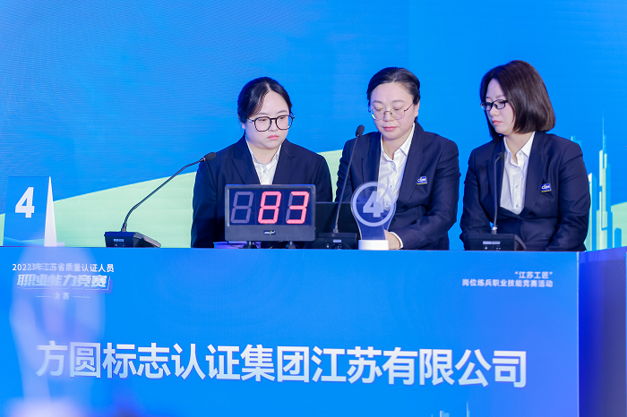 時間:2023年12月16日 2023年12月15日下午,由江蘇省市場監督管理局主辦、國家市場監督管理總局認證認可技術研究中心承辦的“江蘇省質量認證人員職業能力競賽”決賽在南京舉行。方圓江蘇公司三位選手潘玉霞、姚月蘭、黃文君憑借卓越的實力和精湛的專業技能,在決賽中榮獲團體一等獎、個人一等獎和個人三等獎。
